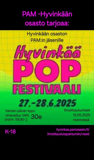 KAIKILLE os.019 JÄSENILLE: Hyinkään POP festivaalit27.-28.6.2025