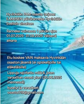 Liput nyt varattavissa. Tarjolla 2pv lippu/jäsen omavastuu 30e (norm.59,90e). -varaa lippusi yläpalkissa olevasta "ilmoittaudu tapahtumiin/viesti" tai sähköpostilla: sihteeripam019@gmail.com -Liput maksetaan ennakkoon suoraan tilille, jonka jälkeen sovitaan miten ja milloin liput voi noutaa. |